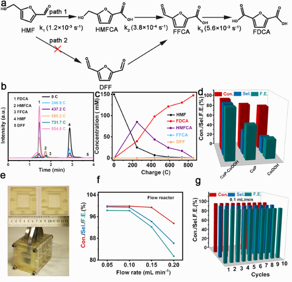 图1.(a)HMF对CoP-CoOOH的氧化路径和动力学常数。(b)HMF氧化反应的色谱图和(c)浓度变化曲线。(d)HMF转化率、FDCA选择性和CoP-CoOOH、CoP和CoOOH的法拉第效率。(e)流动反应器的3D打印部件装配图像。(f)流动反应器中的HMF转化率、FDCA选择性和法拉第效率。(g)流动反应器中HMF的十个连续氧化循环中的转化率、选择性和法拉第效率。