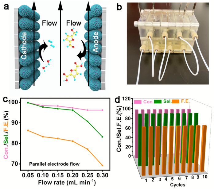 图3. (a)连续流反应器的流动类型。(b)连续流反应器的3D打印组件。(c) 流动反应器不同流速下的HMF转化率、FDCA选择性和法拉第效率。(d) 流动反应器在十个连续循环中的HMF氧化反应。