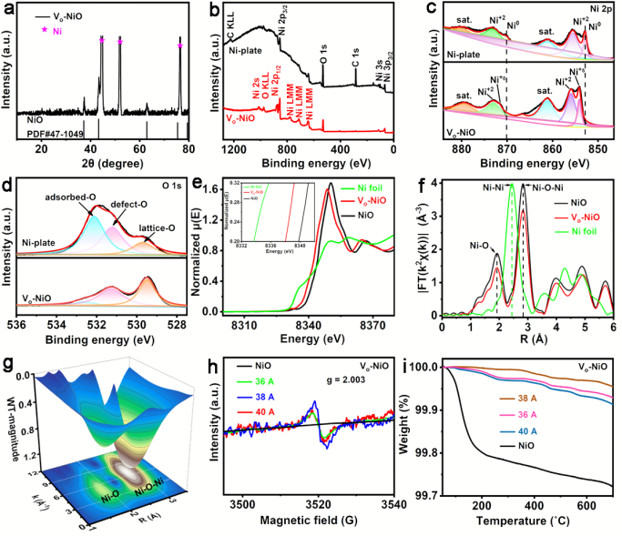 图2.(a)Vo-NiO的XRD图谱。(b)样品的XPS光谱。(c)样品的Ni2p,(d)O1s光谱。(e)样品的XANES Ni K边、(f)EXAFS光谱。(g)Vo-NiO的Ni K边小波变换。(h)样品的EPR光谱。(i)样品的热重分析。