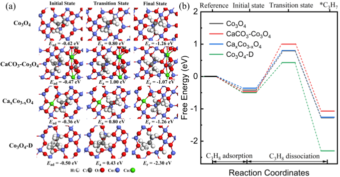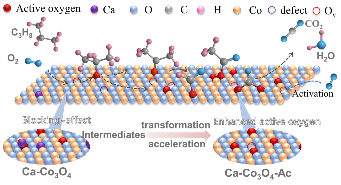 该工作报道的碱土金属掺杂-刻蚀策略,能够有效调控Co3O4表面缺陷位,激活催化剂的表面晶格氧物种,使合成的Ca-Co3O4-Ac催化剂在丙烷完全氧化反应中表现出优异的催化活性和稳定性,并具有较高的反应速率(5.65´10-7 mol g-1 s-1)和TOFs(2.12´10-3 s-1)。此外,碱土金属掺杂-刻蚀策略还提高了Co3O4的比表面积、低温氧化还原性和氧流动性。In-situ DRIFT、DFT理论计算和C3H8-TPD/TPSR表征进一步揭示掺杂-刻蚀策略诱导产生的活性氧物种促进了丙烷在催化剂表面的活化。这项工作加深了对活性氧物种在催化氧化反应中作用的理解,为高效VOCs去除钴基催化剂的设计提供了切实可行的合成策略,并为其他高活性过渡金属氧化物催化剂的开发提供了新思路。