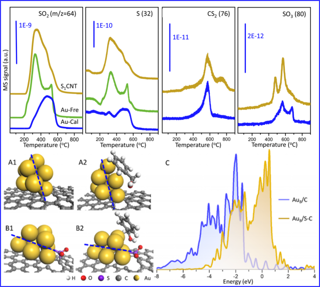 采用纳米金催化剂催化苯甲醇液相氧化反应是一种重要的苯甲醛绿色合成方法。然而,由于Au-C间较弱的相互作用,以碳材料为载体时Au颗粒表面分散性差、稳定性不佳、极易在制备及反应中失活。因此,通过有效手段构建Au-C间强相互作用,针对苯甲醛高选择性及催化剂稳定性,提出催化剂的新型研发路径,对催化材料及工艺的可持续应用具有重要的战略意义。近日,太阳成集团tyc122ccvip官网入口梁长海教授团队利用Au的特殊亲硫性,可控调节Au-C相互作用及界面电荷传递效应,将2.6 nm的金颗粒负载于磺化碳管表面,获得了苯甲醇氧化反应显著的催化活性及循环稳定性。