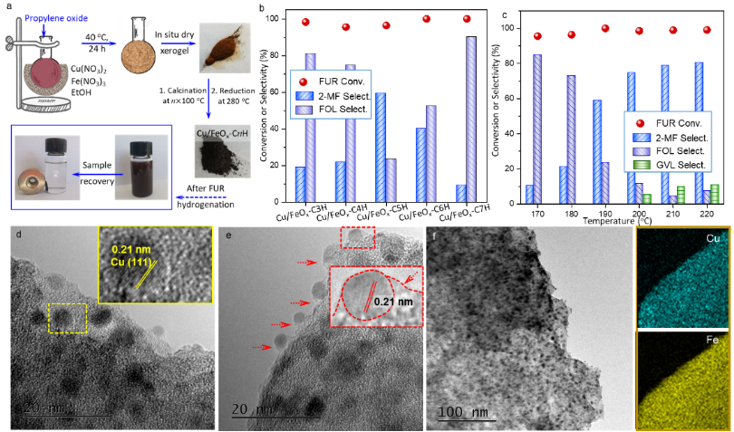 图1. 溶胶法制备的系列Cu/FeOx-CnH催化剂应用于氢转移还原糠醛(FUR)制2-MF(上图),及焙烧并还原后典型Cu/FeOx-C5H催化剂的电子显微图像(下图)