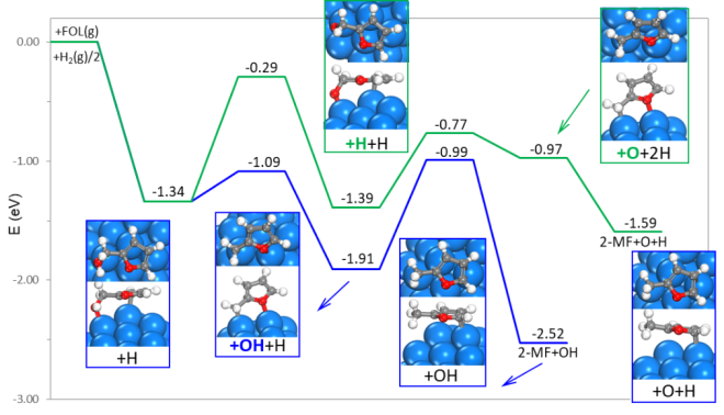 图3. Cu38表面糠醇选择加氢制2-MF的可行路径及能级对比