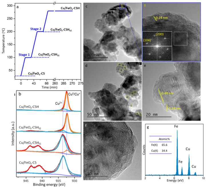图2. 准原位还原Cu/FeOx-C5前驱体程序中表面Cu物种的演变及Cu/FeOx-C5HS2段的催化剂形貌