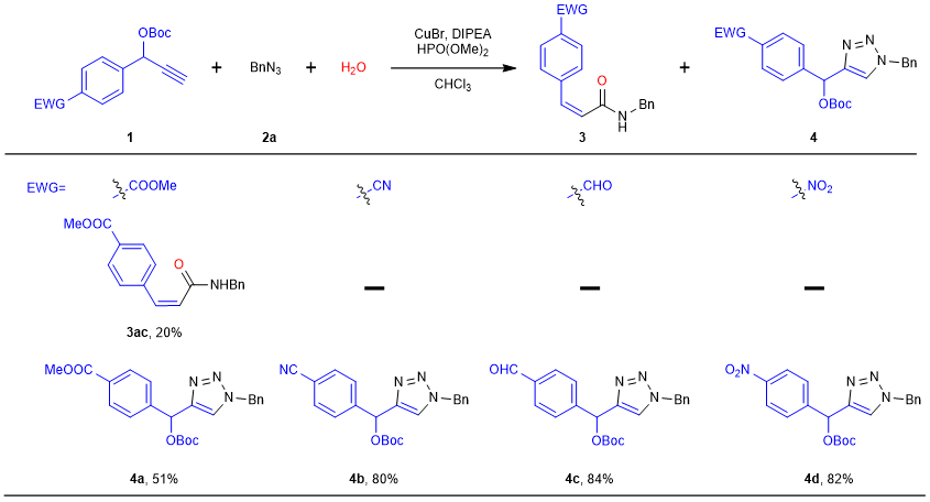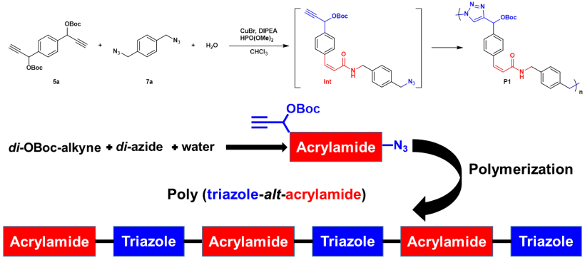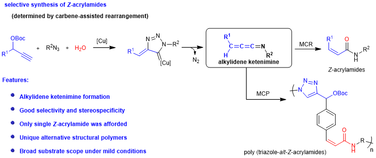 铜催化炔烃、叠氮和水参与的多组分反应能够在温和的条件下,通过精巧的动力学控制,高选择性地形成并转化氮杂联三烯中间体,成功地合成出顺式-丙烯酰胺类小分子化合物。然而,该过程与铜催化的“炔烃-叠氮”环加成反应(CuAAC)相互竞争,并受底物的电子效应影响较大。对于含有吸电子取代基的炔烃,随着吸电子能力的增强,能够观察到三唑类副产物的生成,并逐渐转变为主产物,从而抑制氮杂联三烯的生成。接着,基于课题组前期在多组分聚合(MCP)领域的工作(CCS Chem.,2022,ASAP;Sci. China Chem.2022,ASAP;Macromolecules,2022,ASAP),该多组分反应被成功拓展为多组分聚合。在聚合过程中,首先形成丙烯酰胺结构。由于丙烯酰胺具有一定的吸电子作用,从而控制另一端的炔烃参与“炔烃-叠氮”环加成反应生成三唑结构,最终制备出丙烯酰胺-三唑交替共聚物。