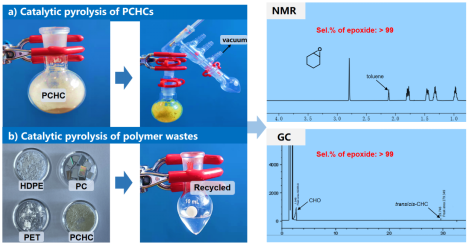 在现实生活中,高分子塑料垃圾往往是多种制品混在一起,无论物理还是化学回收都需要对其进行分拣,尤其是塑料中的存在的助剂会显著影响回收的效率。作者将片状聚对苯二甲酸乙二醇酯(PET,矿泉水瓶)、高密度聚乙烯(HDPE,瓶盖)、双酚A聚碳酸酯(BPA-PC,光盘)和聚碳酸环己烯酯混合,加入金属催化剂进行本体催化热解,发现只有聚碳酸酯环己烯酯发生选择性热解,环氧环己烷的分离产率高达90%,选择性为99%,实现了二氧化碳基聚碳酸酯的选择性分拣热解,表明聚碳酸环己烯酯完全可以在不影响现有塑料垃圾处理措施的基础上进行选择性高效闭环回收。