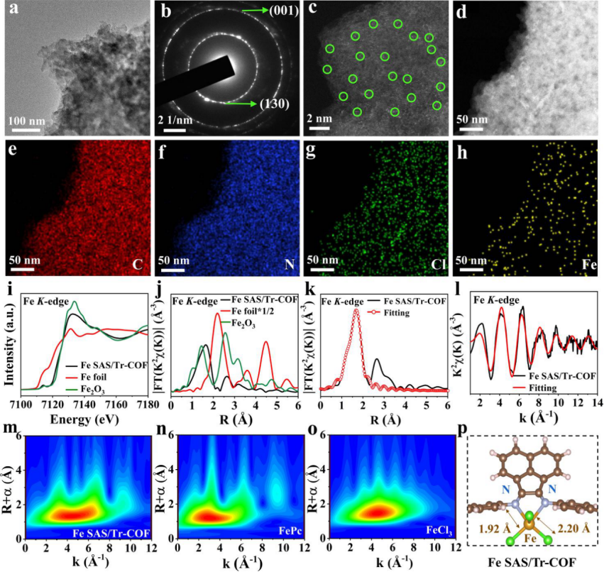 图 2. Fe SAS/Tr-COF催化剂的微观形貌和结构表征