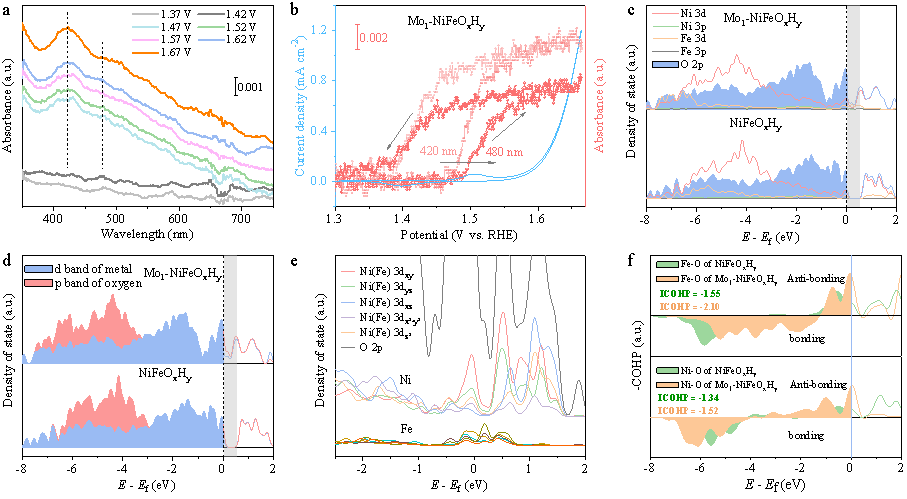 图2. Mo1-NiFeOxHy单原子活性位点催化剂的原位波谱和理论计算解析