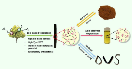 环氧树脂作为目前用量第二大的热固性树脂,在电子电气、光学机械、轨道交通、航空航天等领域中具有广泛的应用。但环氧树脂目前还存在易燃、不可再加工、不易化学降解等关键问题,这严重制约了其进一步的应用发展。同时其原料主要来自不可再生的化石资源,需要不断提升其可持续性。