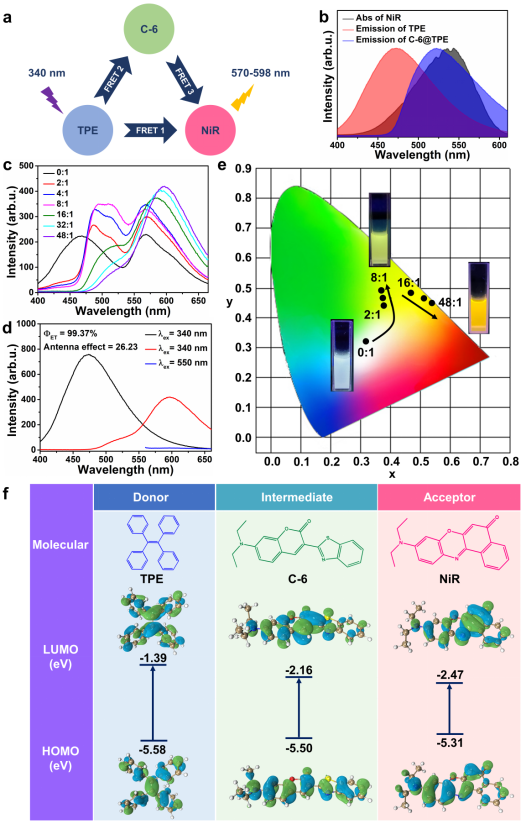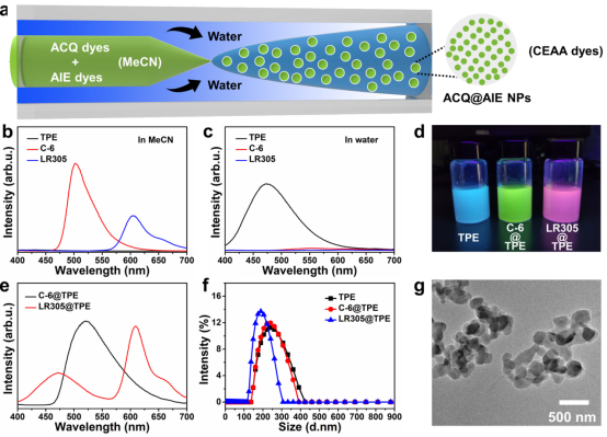 近日,太阳成集团tyc122ccvip陶胜洋教授负责的数字化学研究团队将现代数字设计与制造方法与化学研究相结合,在人工光捕获材料开发领域取得重要进展。研究人员将计算流体力学(CFD)、基于相场的数字孪生模型、量子力学密度泛函计算结合,预测和解释了分子在不同空间尺度下的能量传递和聚集机制。研究者利用3D打印技术制造了CFD优化后的反应器模型,从而实现了连续流的纳米材料宏量合成。这类纳米材料将性质完全相反的聚集猝灭(ACQ)和聚集发光分子(AIE)结合在一起,形成ACQ@AIE型的发光纳米颗粒(CEAA染料)。两种染料在纳米颗粒内实现了智能可控的级联荧光共振能量转移(FRET)过程。最后,利用CEAA染料搭建了高效的光收集体系,实现了99.37%的能量转移效率以及26.23的天线效应。研究中使用的染料均为市售平价染料,无需额外的合成过程,具体包括四苯乙烯(TPE),香豆素6(C-6),尼罗红(NiR)和LR305等。相关研究成果发表于国际著名期刊《自然·通讯》上,文章题目为“Coemissive luminescent nanoparticles combining aggregation-induced emission and quenching dyes prepared in continuous flow”。博士生李冲为论文第一作者,陶胜洋教授为唯一通讯作者。太阳成集团tyc122ccvip官网入口为唯一完成单位。