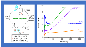 近日,太阳成集团tyc122ccvip徐铁齐教授与科罗拉多州立大学合作,制备出了具有优异热性能和物理性能的新一代可循环塑料,研究成果以“A circular polyester platform based on simple gem-disubstituted valerolactones”为题,发表在《自然•化学》(Nature Chemistry)杂志上。该工作中,以工业上可以大规模生产的生物基戊内酯为原料,合成了偕二烷基取代的戊内酯(VLR2),其在温和的条件下可控转化为PVLR2。偕二烷基基团的引入,有效地降低了聚合上限温度,使聚合/解聚达到理想平衡,聚合物通过简单地加热即可100%转化为VLR2单体,而这些单体可以重新聚合形成与之前相同的聚合物,从而实现单体-聚合物-单体的闭环循环。聚合物的力学性能、耐热性能和气体阻隔性能超过低密度聚乙烯(LDPE)。这项工作建立了一个简单的基于VLR2的高性能完全循环聚酯平台,并为构建高性能、可循环高分子材料提供了新的设计策略。