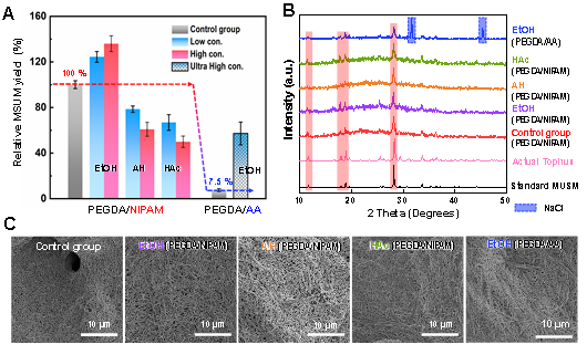 图2. 不同水凝胶材料调控的尿酸钠结晶过程对比:(A)相对质量产率;(B)XRD谱图;(C)SEM图像。