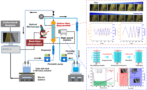 首先,建立如图1所示的膜辅助反应结晶(MARC)在线观测装置,利用光学显微镜和高速摄像机对膜表面的流动状态进行实时在线观测。对于乙醇(管程)-水(壳程)体系,液层厚度也在周期性变化的管壳程流速下,展现出优异的可调性和灵敏响应性。对于难互溶的丁醇(管程)-水(壳程)体系,初始渗透至壳程的丁醇溶液会以液滴的形式依附在膜表面,随后在管程压力和壳程雷诺数共同作用下,展现出了两种运动行为:即以小液滴从膜表面脱附,或者继续在膜表面生长而转变成液层。进一步,团队构建了液滴受力分析的模型,通过脱落-依附曲线和判据来解释和预测流态演变模式。