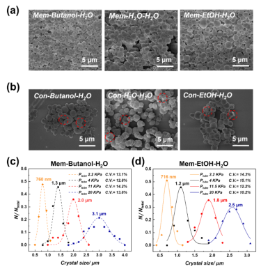 图2 晶体形貌和粒度分布对比:(a)膜辅助反应结晶得到的碳酸钙晶体;(b)传统反应结晶得到的碳酸钙晶体;(c)不同管程压力条件下丁醇-水体系得到的晶体粒度分布;(d)不同管程压力条件下乙醇-水体系得到的晶体粒度分布