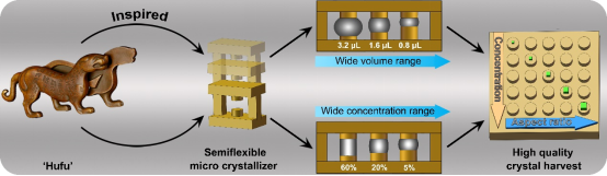 进一步,项目团队为定向构建中心聚集型环流、选择性制备高质量晶体,受虎符的启发,利用高精度3D打印技术制备了由两个元件配合使用的半柔性微结晶器,实现了具有智能调节和自主适应的异形液滴的可控构建。通过智能化地实时调节元件间距,改变液滴长径比与气液蒸发界面,有效调节了异形液滴内部马兰戈尼流与毛细管流的发展空间和相对强度,将中心聚集型环流的发展机制转变为强制空间约束诱导,实现了规则形貌、大尺度的高质量晶体的选择性制备。(J. Colloid Interface Sci., 2023, 629: 334-345.)