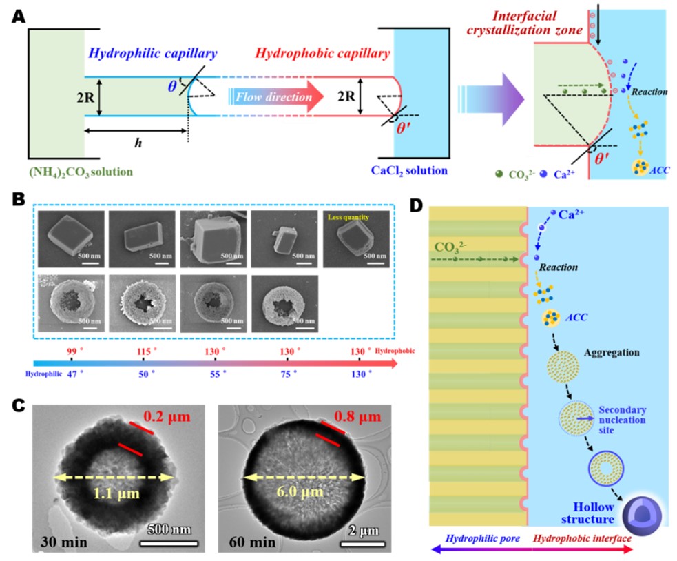 图1.Janus均孔膜精准制备中空CaCO3晶体超结构:(A)定向调控离子传递和界面结晶区构建原理;(B)不同界面浸润性Janus膜的调控结果;(C)不同反应时间下的晶体超结构调节结果;(D)Janus膜界面制备中空晶体超结构原理