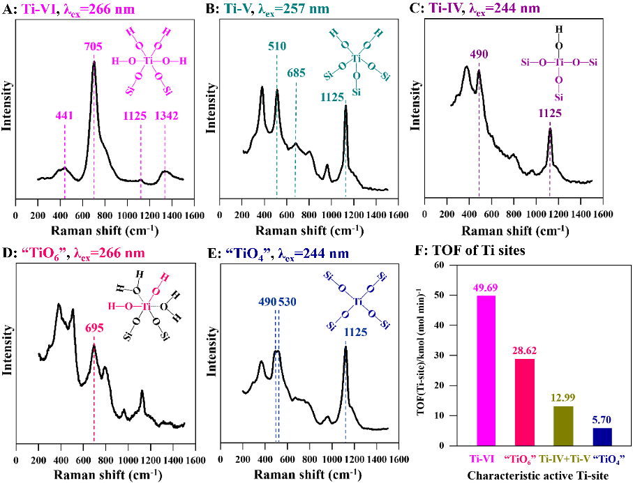 图 新型钛中心Ti-VI 、Ti-V和现已知钛中心Ti-IV、“TiO6”和“TiO4”的紫外共振拉曼激发光波长(λex)、特征拉曼谱峰和结构以及钛中心的转换频率(TOF)。