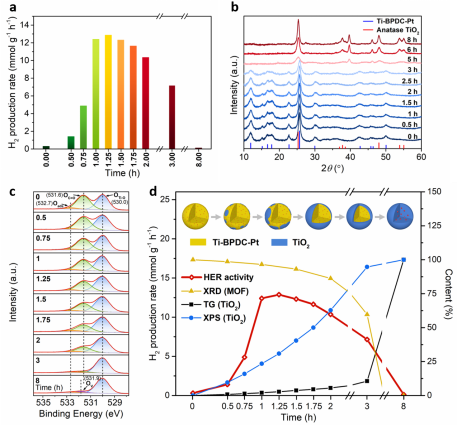 太阳能驱动水分解是生产清洁可再生氢能的潜在长期战略。自从发现TiO2的光催化性能以来,由于其优异的稳定性和无毒性,成为研究最广泛的光催化剂之一。众所周知,驱动光催化反应需要三个主要步骤,即光激发、电荷分离和迁移以及表面反应。研究人员通过掺杂和构建缺陷将TiO2的光响应扩展到可见光区,通过构建异质结改善光生电荷和空穴的分离,通过加载助催化剂促进表面反应,任一单独的性能优化步骤中都取得了巨大的进展。但由于各组分之间的相互干扰,考虑所有因素以设计高效催化剂仍然是一个巨大的挑战。MOFs由于其高比表面积和可调控性,在过去十年中引起了光催化领域的广泛关注。据报道,特定配体能够实现金属螯合,起到助催化剂作用。此外,MOFs还能够制备含缺陷的氧化物半导体。在此基础上可以假设,通过精细控制MOFs有机组分的热解,能够形成由Ti-MOF和从Ti-MOF中原位生长的TiO2组成的异质结,此时作为助催化剂的大量金属位点可以选择性地固定在异质结的Ti-MOF相上,而不接触原位生长的TiO2。考虑到各组分之间的互不干扰,该催化剂被认为是一种高效的光催化系统。