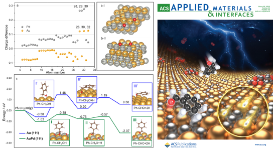 XRD衍射图像分析及球差STEM图像的分析结果显示,双金属纳米颗粒主要由AuPd合金组分构成。经过氧化气氛中300⁰C焙烧处理,合金颗粒中出现Pd相分离,并在表面形成无定型的PdO纳米碎片,在双金属颗粒表面观测到明显的晶格膨胀现象及属于PdO的晶格条纹;XPS结果同时证实Pd元素随着Au/Pd原子比下降在表面规律性富集。采用DFT模拟计算对AuPd双金属位点间的电子环境及无碱条件下的反应机制进行解析。证实Au-Pd双金属颗粒表面形成由Pd向Au表面转移电子的配对活性位点,调整苯甲醇在金属活性位点表面的吸附构型、降低反应能垒、促进苯甲醛产物的选择性合成。表面PdO碎片作为活性氧物种的运载体完成活化补充氧物种的循环过程。