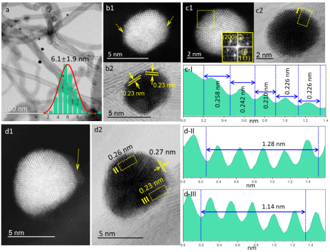 程序升温测试及无碱条件下的反应过程分析表明,Au/CNT或Pd/CNT催化活性匮乏,当碱助催化剂存在时,才能展现出较弱的苯甲醇氧化性能。相比之下,AuxPdy/CNT催化剂即使在无碱条件下也可以表现出极佳的反应活性,在温度仅为80⁰C时,苯甲醇的转化频数(TOF)高达1274 h-1,实现苯甲醛91.8%的选择性,较之已报道的多种高活性金催化剂具有更加突出的无碱催化活性。