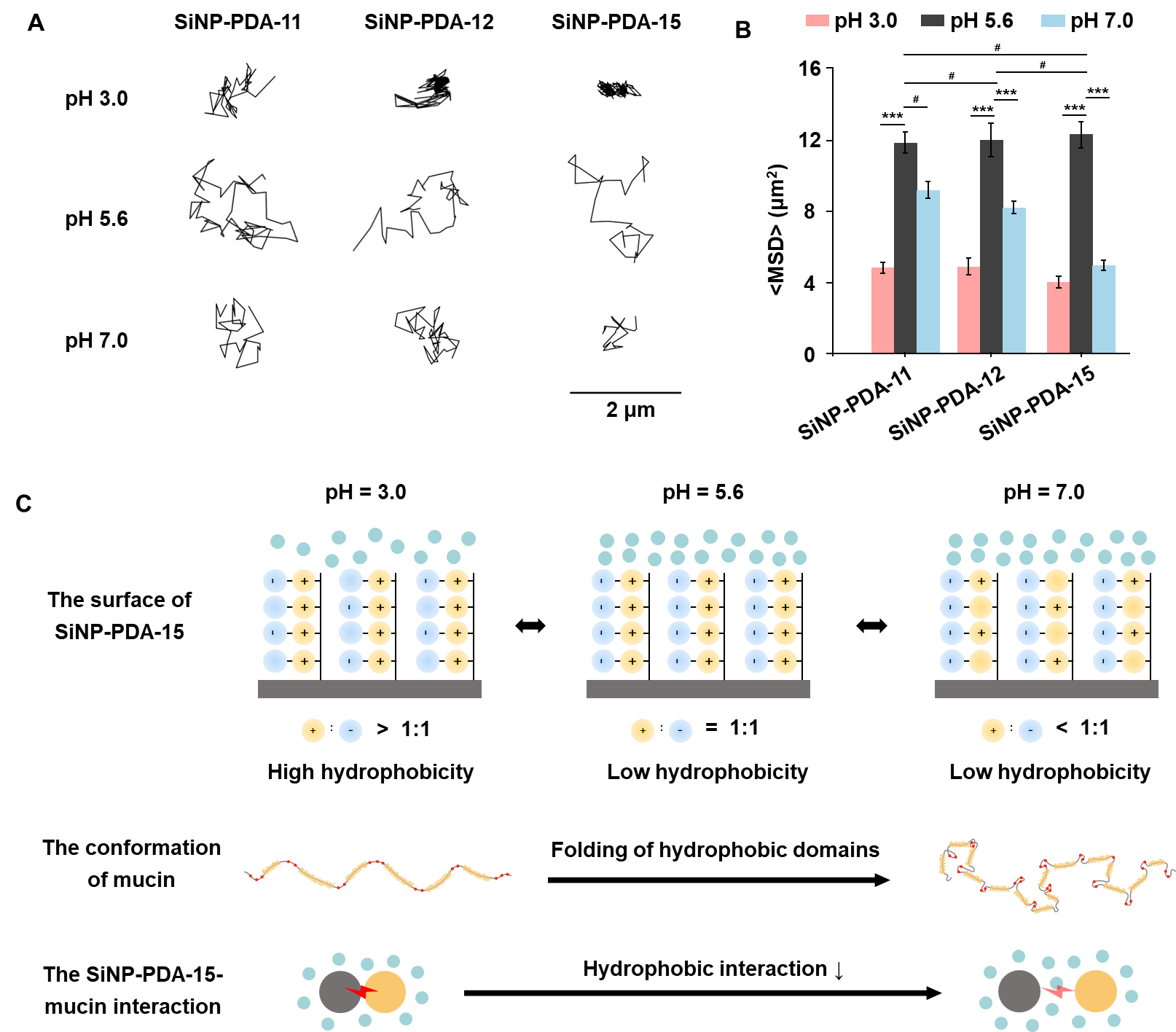 图2. pH介导的SiNPs-PDA黏液穿透能力表征及与机制分析