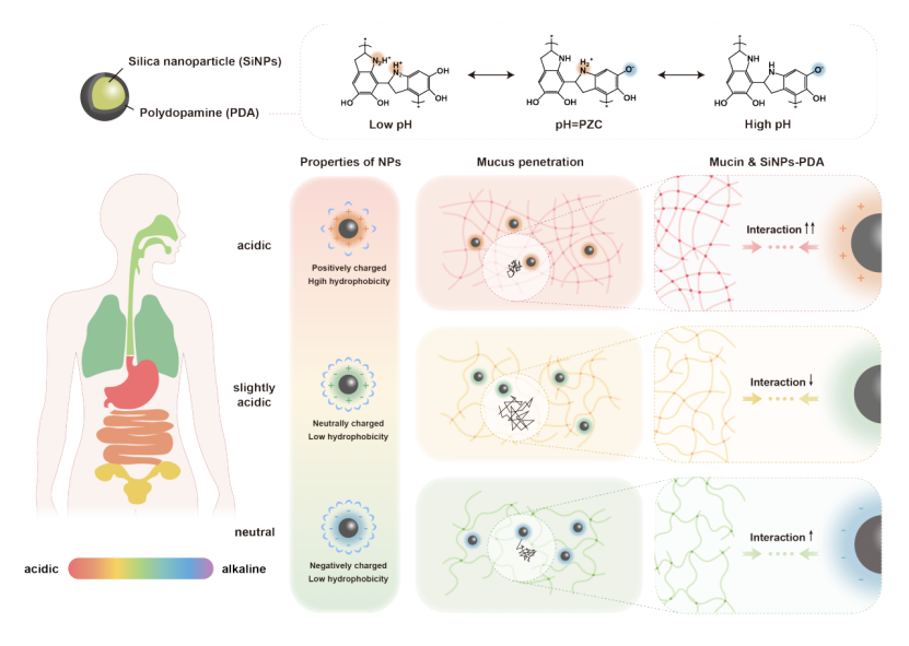 图1.两性离子聚多巴胺涂层改性纳米颗粒的pH介导的黏液穿透行为及机制分析