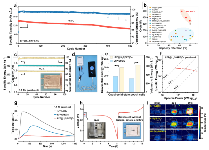 图2.准固态无负极电池的(a-f)电化学性能(g-i)与安全性