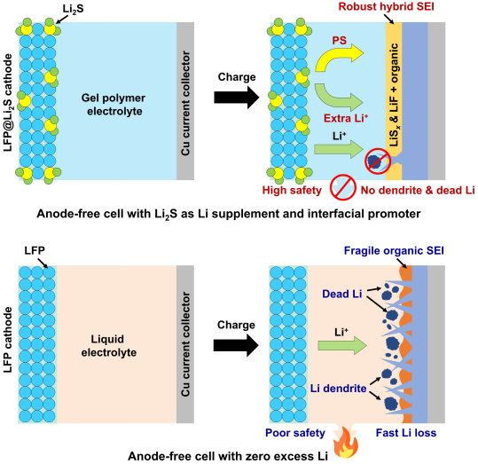 图1.利用硫化锂作为双功能补锂剂与界面改性剂,通过锂补偿耦合界面SEI膜性质调控抑制无负极电池不可逆锂损失的技术策略