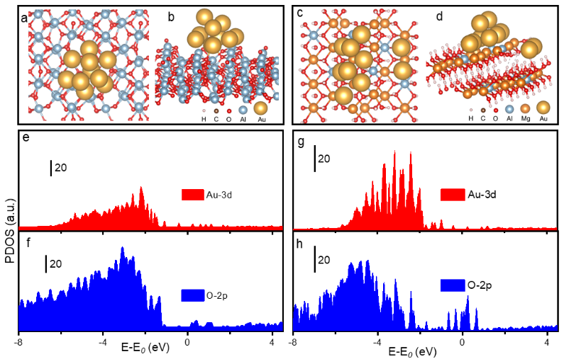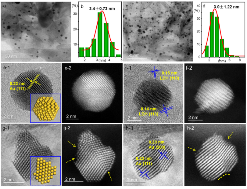 研究结果表明,基于层状双氢氧化合物MgxAl-LDH(水滑石)载体,调控Mg/Al原子比例,可实现MgxAl-LDH (015)晶面的优势生长。由于MgxAl-LDH(015)和Au(111)晶面间存在特殊的晶格匹配现象(匹配度> 98%),Au原子更易于在LDH(015)晶面发生迁移和重排。当Mg/Al比为3.0–3.5时,LDH与Au颗粒强相互作用,导致Au原子在晶格应力的作用下沿载体铺展,低配位Au原子在表面富集并形成缺陷型金颗粒。
