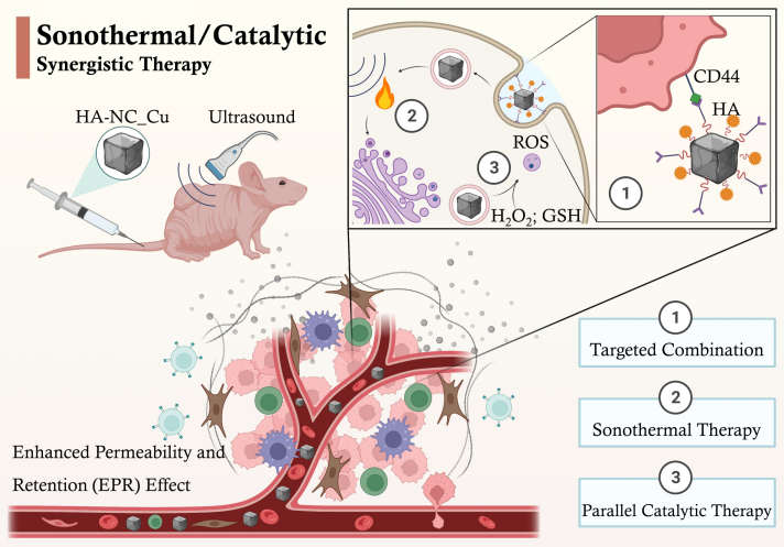 图1 限域单原子铜活性位点介导的声热/催化联合治疗策略示意图