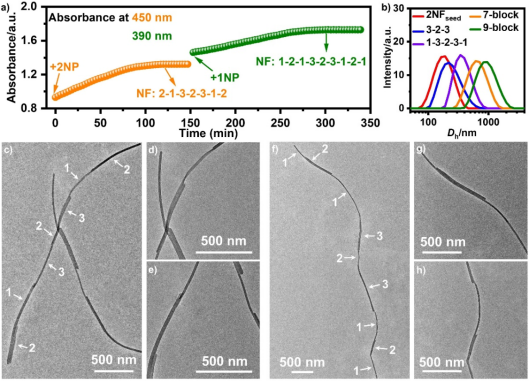 进一步通过顺序种子超分子聚合,成功在三嵌段共聚物末端实现异质成核-生长,构筑了三组分五嵌段共聚物(图2)。最后,通过逐步异质成核-生长,创制了七嵌段和九嵌段三组分超分子BCPs(图3)。动力学路径的精确控制是成功制备多达九个嵌段BCPs的关键。