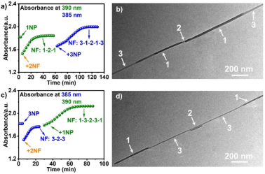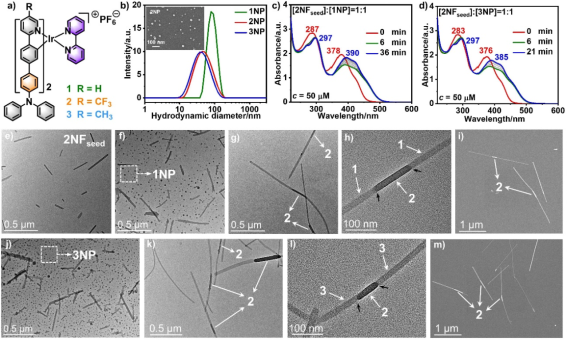 综上,作者通过动力学控制来抑制单体的自发组装并以动力学物种作为单体的存储站,成功构建了铱配合物三组分多嵌段超分子共聚物。其中,异质成核-生长过程可由时间依赖的光谱监测,多嵌段共聚物的微结构可由透射电镜和扫描电镜进行表征。该研究为空间结构复杂的八面体金属配合物三组分BCPs的制备及其序列与性质关系研究提供了新方法。