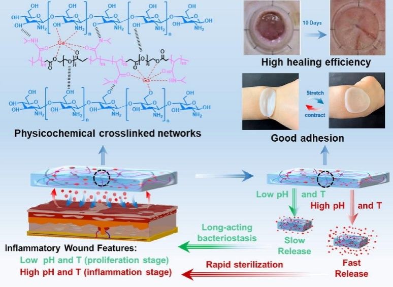 近日,太阳成集团tyc122ccvip官网入口高效分离膜与膜工程团队联合太阳成集团tyc122ccvip官网入口附属中心医院成功开发了一种具有温度/pH双响应型且可负载抗菌抗炎Ga3+的多功能水凝胶敷料,其中,Ga3+主要通过螯合作用存在于水凝胶敷料分子网络内部。由于交联互穿网络的存在,制备的水凝胶敷料具有大面积塑性、中等机械弹性、良好的皮肤粘附性和剥离性,以及优异的热稳定性。Ga3+的存在使水凝胶敷料具有抗菌和抗炎的性能,提高了其机械性能和热稳定性;温敏性基团和壳聚糖单体的存在赋予该智能水凝胶敷料温度和pH响应特性,可以灵敏地实现高温或碱性条件下Ga3+快速释放,低温或酸性条件下镓离子缓慢释放的效果(图1)。