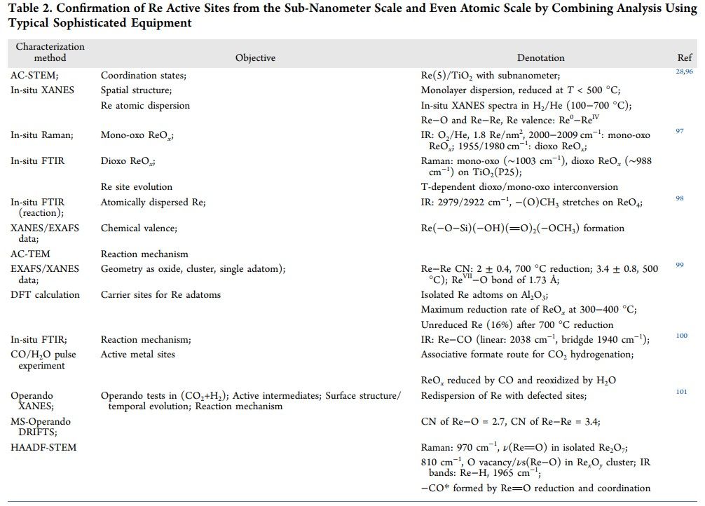 最近,研究工作开始后采用AC-STEM图像和原位实验等多种精细表征技术组合,全面剖析Re基催化剂中活性中心的组成形式。具体包括气氛下的FTIR光谱、原位XAS测试、实验条件下的拉曼光谱、(环境)球差电镜等,通过多种测试手段对比验证Re中心的结构信息,在更小尺度下(亚纳米、原子尺度)给出Re位点详细结构的直接证据,代表性工作如表2所示。相关研究工作可进一步揭示Re的原子分散、位置演化、空间/几何结构和缺陷结构,并推断反应机理。