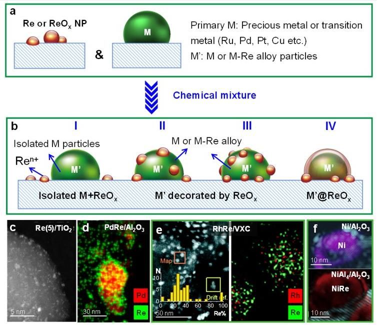 图2. 金属位点和铼物种间作用及不同形式接触界面的示意图、电子显微镜图像及能谱分析