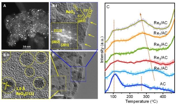 图3. 碳载体表面分散的ReO3颗粒形态及NH3-TPD