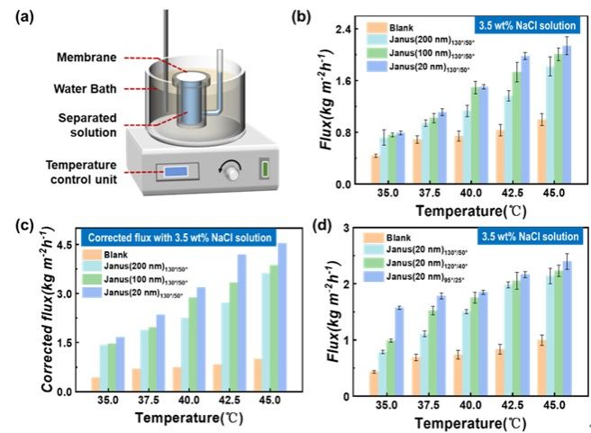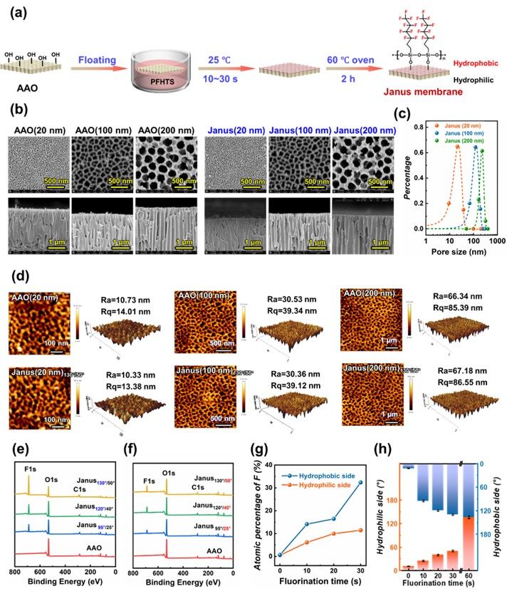 首先,研究团队采用单侧浸泡法,制备了系列不同孔径及接触角梯度变化的Janus膜。随后,通过SEM、AFM、XPS、WCA等表征手段,证实了具有有序排列垂直孔道及不对称润湿性Janus膜的成功制备(图1)。随后,基于自主设计的低温差膜蒸馏装置,探究了Janus膜对水蒸发速率的影响。实验结果表明,Janus膜通量表现出明显的孔径和接触角依赖性,随着孔径及接触角的下降,通量表现出增加的趋势。优化的Janus (20 nm)95°/25° 膜在45℃(进料侧)/25℃(渗透侧,常压)下的蒸发通量达2.4 kg m−2 h−1,达到纯水界面蒸发的2.5倍,理论蒸发焓仅为纯水蒸发的30%(图2)。