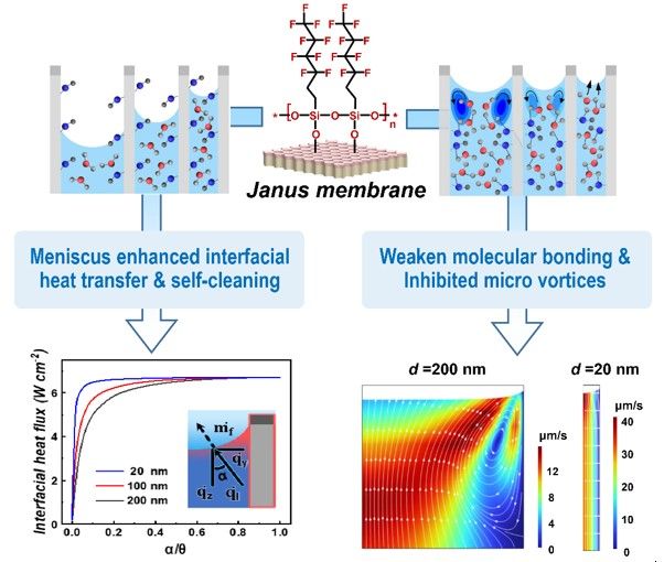 本研究开发了一种新型微/纳米直通孔道Janus膜,其能够在低温差下显著提高水蒸发速率,进而揭示了一种通过协同调控膜微/纳米结构和润湿性来强化蒸发的新策略。结果表明,在Janus膜孔内,凹液面增加了薄水层的比例,从而增强了壁面处的微尺度传热;较小的纳米孔限制了液气界面微尺度涡旋的发展,并防止了界面处中间水的返混,促进了水的蒸发。这种设计策略和强化机制为未来的微纳米结构薄膜在海水淡化和水处理领域的应用提供了重要的指导和理论基础,对于开发高效低能耗的海水淡化技术具有潜在的重要意义。