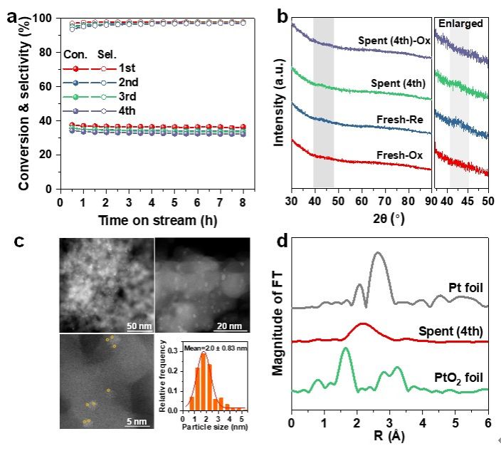 作者还对催化剂的再生循环稳定性进行了测试。在每次反应后,0.5PtHEA/SiO2催化剂在500 ℃空气中处理30 min,然后在600 ℃ 20% H2/Ar下还原。连续4次再生后,丙烷转化率仅从37.5%下降到34.4%,具有较好的循环稳定性。值得注意的是,即使经过4次氧化还原再生循环后,催化剂仍然保持了和新鲜催化剂一样非常弱的衍射峰,表明烧结的程度很小,通过AC-STEM-ADF也证实了这一点。EXAFS光谱中也未检测到Pt-Pt键的峰,表明没有发生Pt原子的烧结。