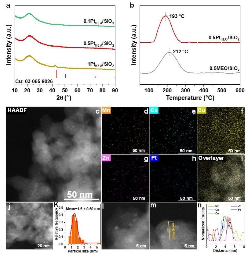 通过X射线衍射(XRD)和球差电镜(AC-STEM)等对高熵催化剂的颗粒分布情况进行了表征。在高熵催化剂0.5PtHEA/SiO2中,金属颗粒以1-2 nm均匀分散在SiO2载体上,且各种元素在载体上均匀分散。EDS线扫结果和高负载量下金属颗粒的EDS mapping确定了形成的金属颗粒上存在五种金属元素。同时,从AC-STEM-ADF中观察到了在纳米颗粒上原子级分散的Pt位点。