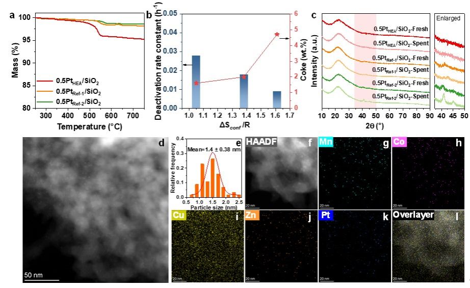 TG分析表明,在相同条件下反应24 h后,0.5PtHEA/SiO2、0.5PtRef-1/SiO2和0.5PtRef-2/SiO2上的积碳分别为4.7 wt.%、2.0 wt.%和1.6 wt.%。随着Cu和Co元素的依次引入来增强催化剂的构型熵,失活速率常数显著降低,但积碳量略有增加。TEM结果显示,0.5PtHEA/SiO2催化剂仍以1-2 nm均匀分散在载体上,而5PtRef-1/SiO2和0.5PtRef-2/SiO2则发生了不同程度的团聚,表明0.5PtHEA/SiO2催化剂具有良好的耐高温烧结性能。