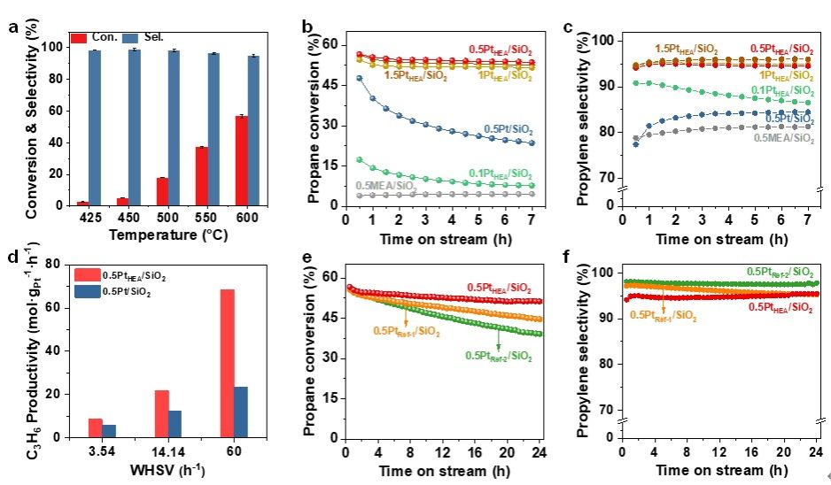 该工作开发的用于丙烷脱氢制丙烯的高活性、高稳定性且易再生的新型高熵催化剂为丙烷脱氢催化剂的设计开辟了新的路径,并为苛刻条件下金属纳米颗粒的稳定提供了新思路。此外,这项研究为设计合成优异性能的高熵催化剂提供了新的视角,推进了其在热催化相关应用中的研究进程。研究工作得到国家重点研发计划、国家自然科学基金等项目的支持。