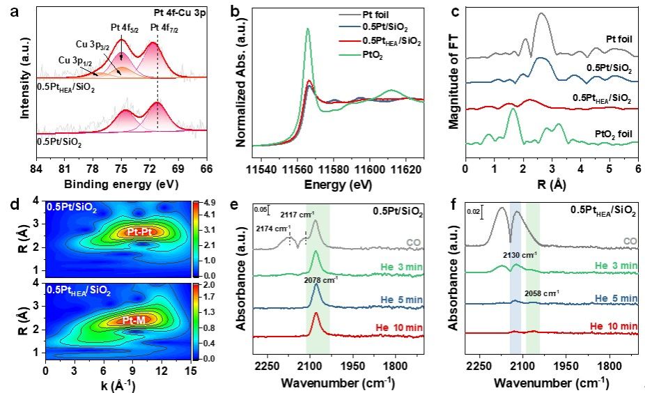 此外,作者也对还原前后样品的电子结构进行了详细的表征。还原前0.5PtHEO/SiO2样品的XPS结果表明在高熵氧化物中金属以Pt4+、Mn2+、Co2+、 Cu2+ 和 Zn2+存在。还原后元素化学态发生了明显变化,其中Mn和Zn以氧化态和金属态共存,Pt、Co和Cu以金属态存在,且Pt、Mn和Co向Cu和Zn发生了电子转移。Pt 4f的XPS结果表明:与Pt/SiO2相比,PtHEA/SiO2催化剂中Pt的价态相对较高。Pt/SiO2 和 PtHEA/SiO2 的Pt L3 边 X 射线近边吸收结构 (XANES)显示两种催化剂的Pt L3 边 XANES 光谱与Pt foil非常相似,与 PtO2 截然不同,表明铂为零价金属态。0.5PtHEA/SiO2 的白线强度略高于 0.5Pt/SiO2,表明PtHEA/SiO2催化剂中存在带正电荷的铂原子。扩展X射线吸收精细结构(EXAFS)结果显示,在0.5PtHEA/SiO2催化剂中仅检测到Pt与其它金属(Mn/Co/Cu/Zn)的配位,未检测到Pt-Pt配位,表明在高熵纳米颗粒中Pt原子被其它元素充分隔离。