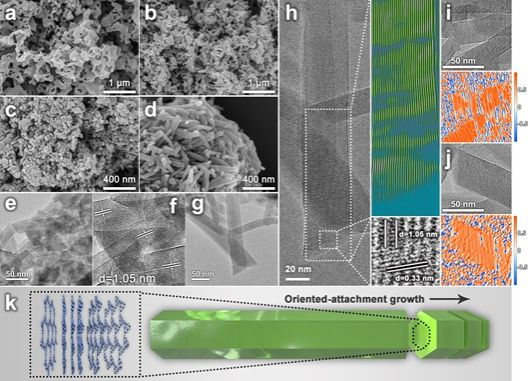 图1. 高结晶性PHI的形貌结构及定向附着生长机制示意图
