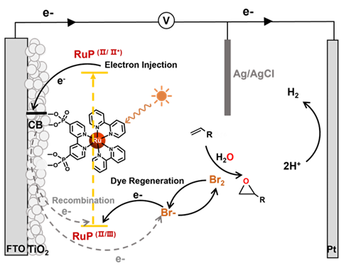 利用光电化学池分解水是实现人工光合作用的重要途径,然而光阳极上进行的水氧化反应面临诸多挑战,如高热力学能量需求和动力学缓慢等。尽管目前已经开发了诸多策略,但光阳极的效率仍未达到实际应用的需求。作为太阳能清洁转换的新途径,光阳极上的水氧化反应理论上可以用能量需求较低的有机底物氧化反应替代,实现高附加值化学品的制备与光阴极制氢相结合。近期,太阳成集团tyc122ccvip官网入口精细化工国家重点实验室李斐教授构建了一种钌基染料敏化光阳极,以LiBr为电子传输中介,以水为氧源,实现了对烯烃的高效高选择性光电催化环氧化。