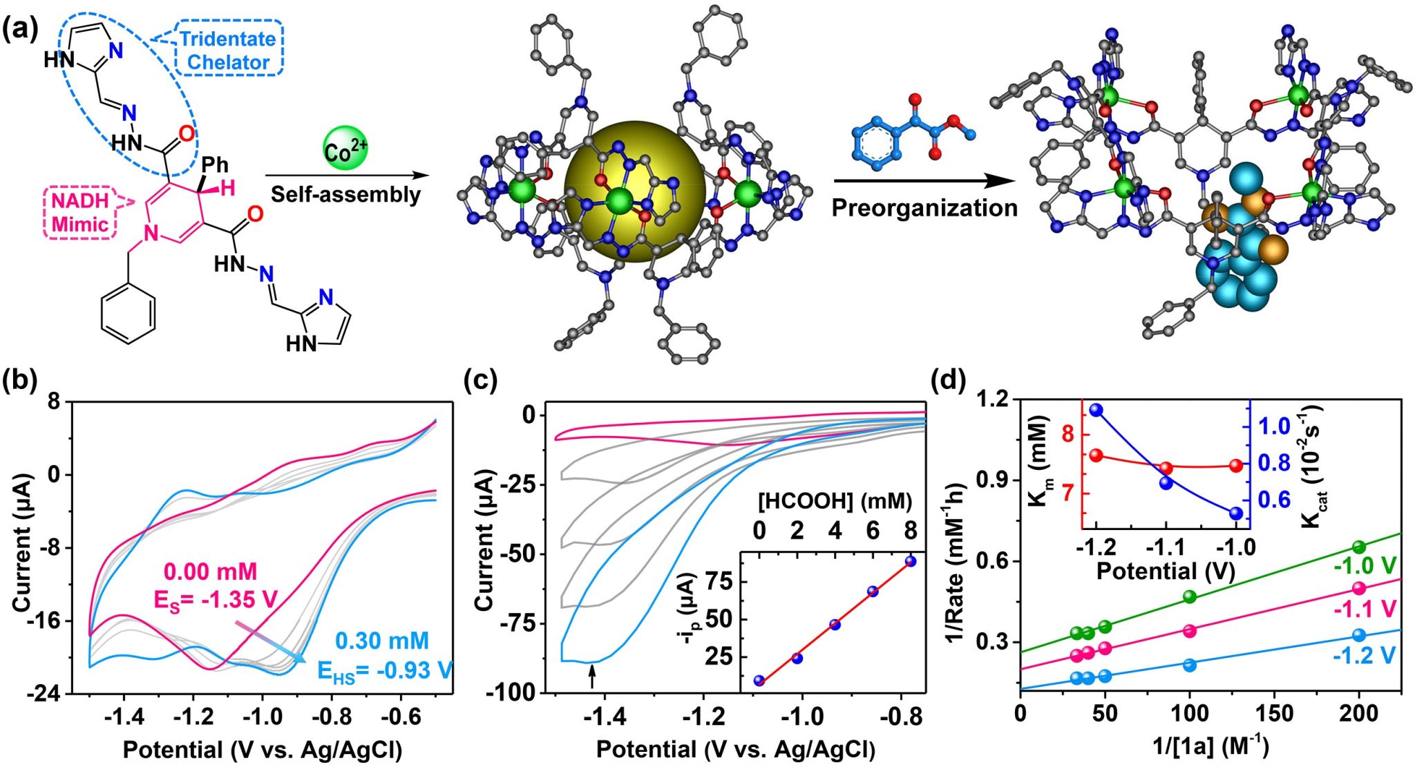 图2.(a)配位胶囊及预平衡包合物种的组装;(b)包合物电位变化;(c)析氢电位;(d)电催化动力学。