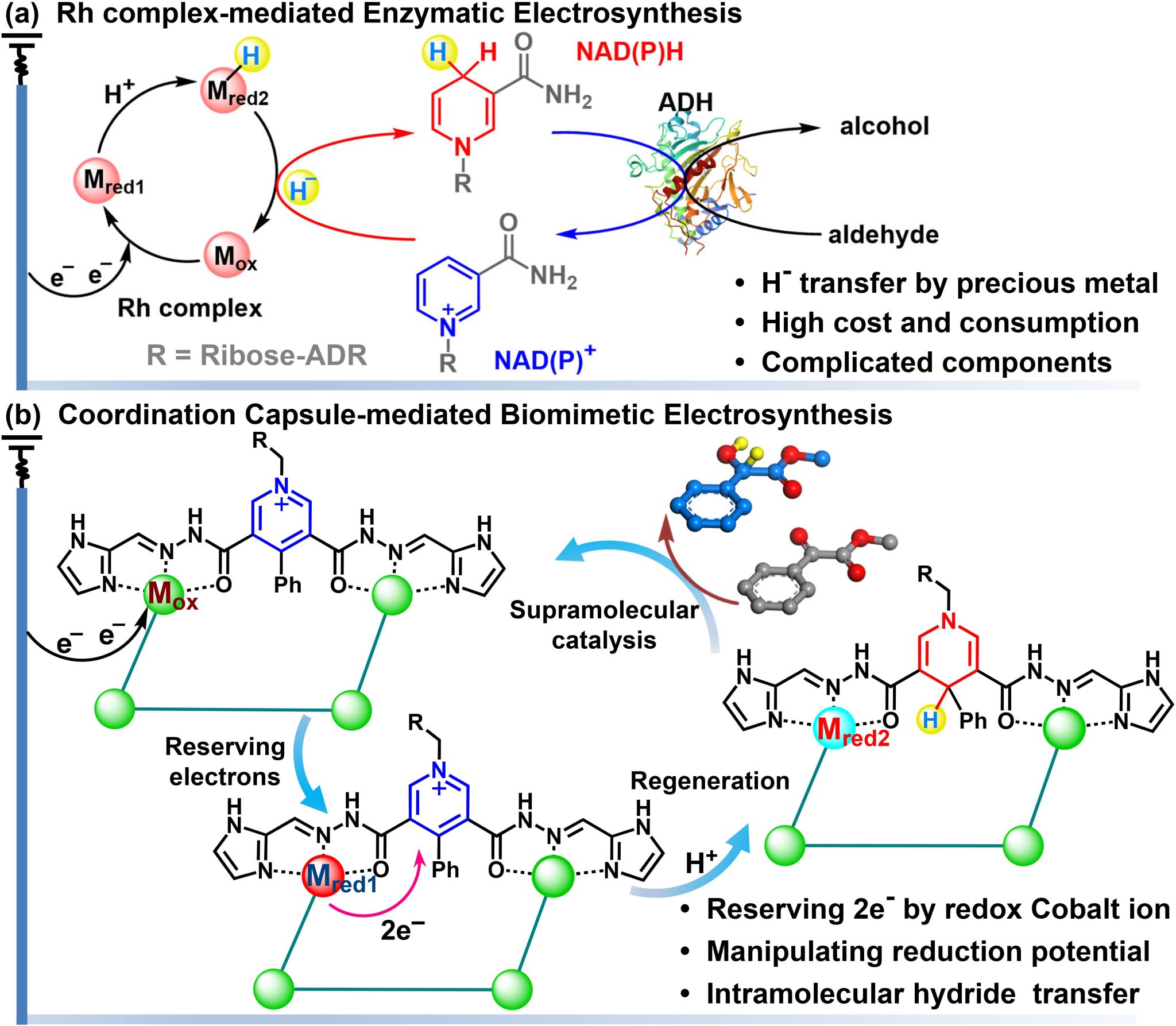 图1. (a)贵金属Rh介导的酶促电合成;(b)配位胶囊介导的仿生电合成。