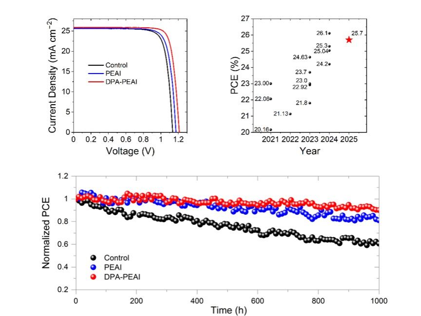 采用DPA-PEAI修饰的器件最终获得了25.7%的光电转换效率,是目前基于共轭铵盐配体的2D/3D钙钛矿太阳能电池的最高效率之一。DPA-PEAI修饰的器件在最大功率点追踪(MPPT)下,连续光照1000小时后保持了初始效率的90%,表现出良好的运行稳定性。