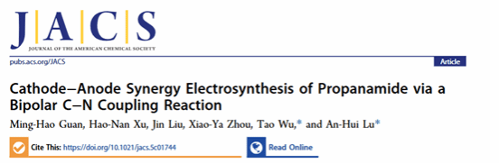 近日,太阳成集团tyc122ccvip陆安慧教授团队采用电化学法合成酰胺领域取得新进展,采用电化学阴阳双极协同方法,以硝酸盐和正丙醇为反应物,在温和条件下反应高效合成酰胺。相关成果以“阴阳双极协同C-N偶联电合成丙酰胺”“Cathode-Anode Synergy Electrosynthesis of Propanamide via a Bipolar C-N Coupling Reaction”为题发表在《美国化学会志》(Journal of the American Chemical Society)上。该论文第一作者为关铭昊博士生,通讯作者为陆安慧教授和吴涛副研究员。