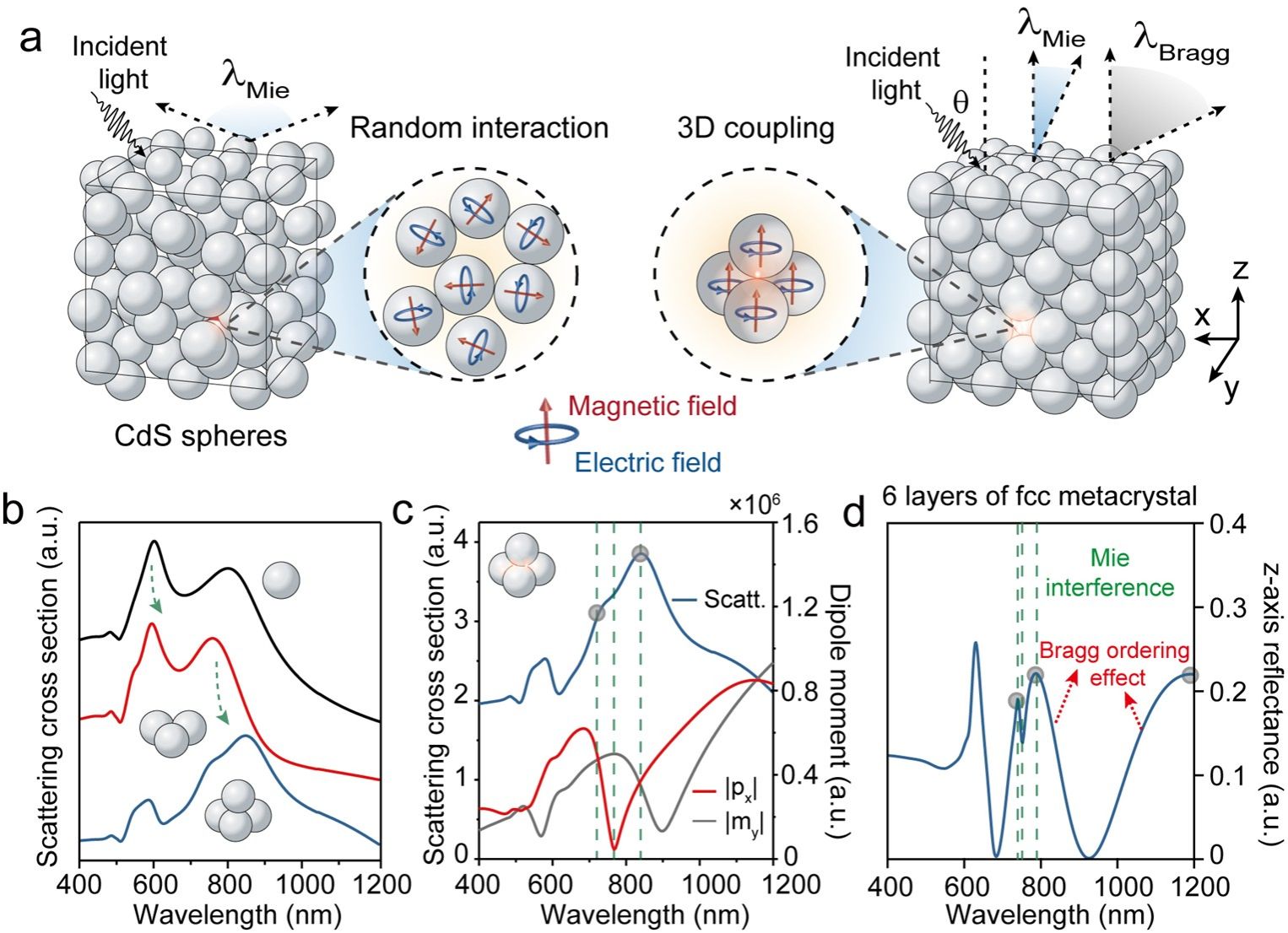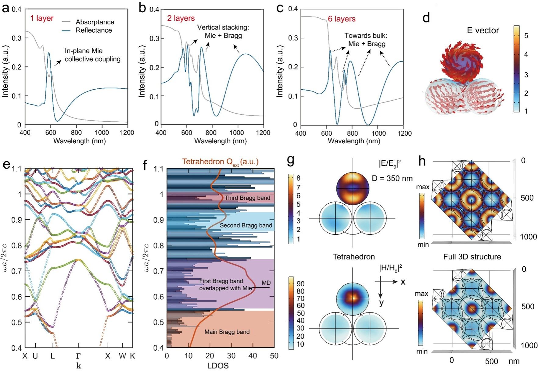 首先,作者通过多尺度电磁模拟揭示了三维有序结构的共振耦合机制。单颗CdS球(350 nm)的散射谱呈对称峰形,而三球聚集体仅引起微小蓝移。关键突破在于四面体单元:电偶极与磁偶极干涉在767 nm处形成Fano凹陷,并在724 nm和836 nm处产生新共振峰,证明近场耦合可重构光学响应。进一步对六层面心立方阵列的模拟显示,长程有序将单元干涉效应放大为窄带反射谷,并与>900 nm的布拉格宽带共存。共振位点与四面体特征峰的一致性表明,周期性晶格能将局域干涉转化为米氏共振耦合增强,同时保留布拉格散射特性。